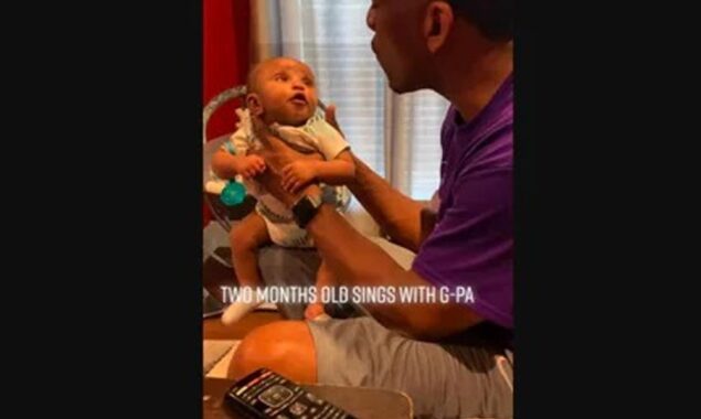 دادا کو سریلی آواز میں گانا گاتا دیکھ کر دو ماہ کا بچہ خود کو نہ روک سکا اور اپنی آواز میں گانا گنگنانے کی کوشش کرنے لگا۔