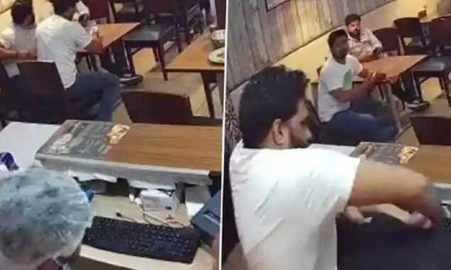 یہ ہی نہیں بلکہ تینوں آدمی ملازم کو گھسیٹ کر ریسٹورنٹ سے باہر لے جاتے ہیں اور بہت لاتیں بھی مارتے ہیں۔