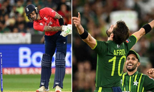 تفصیلات کے مطابق میلبورن کرکٹ گراؤنڈ میں ہونے والے ٹی ٹوئنٹی ورلڈ کپ کے فائنل میں پاکستان کے 137 رنز کے جواب میں انگلینڈ نے اپنی اننگ کا آغاز کیا تو شاہین شاہ آفریدی نے پہلے ہی اوور میں ایلکس ہیلز کو بولڈ کیا تھا۔