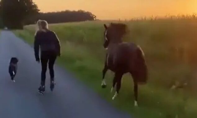 وائرل ہونے والی ویڈیو میں دیکھا جا سکتا ہے کہ ایک خاتون صبح سویرے اسکیٹنگ کررہی ہے ساتھ میں سیاہ گھوڑا اور سیاہ کتا کو بھی دوڑتے ہوئے دیکھا جا سکتا ہے۔