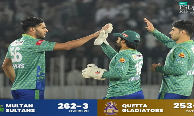 کوئٹہ گلیڈی ایٹرز کی ٹیم 263 رنز کے تعاقب میں مقررہ 20 اوورز میں 8 وکٹوں کے نقصان پر 253 رنز بنا سکی، اس شکست کے ساتھ ہی کوئٹہ گلیڈی ایٹرز کا پی ایس ایل 8 میں سفر اپنے اختتام کو پہنچا۔