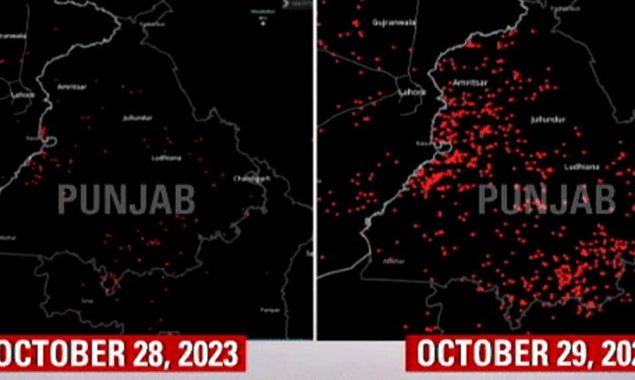 ناسا کے ورلڈ ویو سیٹلائٹ نے 25 سے 29 اکتوبر کے درمیان پنجاب میں پرالی جلانے کے واقعات کی تصاویر شیئر کی ہیں جس میں کھیت کی آگ کو سرخ نقطوں سے دکھایا گیا ہے