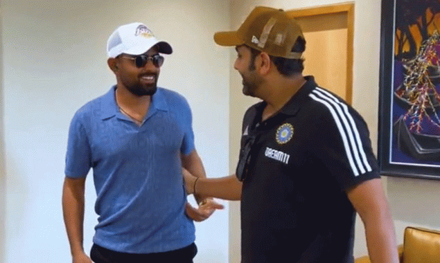 قومی ٹیم کے کپتان بابر اعظم نے روایتی حریف اور میزبان ٹیم بھارت کے کپتان روہت شرما کے ساتھ اسٹیج پر انٹری دی۔