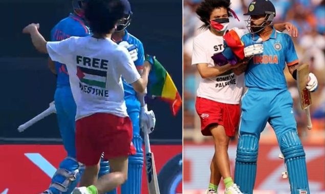 احمد آباد کے نریندر مودی کرکٹ اسٹیڈیم میں کھیلے جارہے میچ کے 14ویں اوور میں فلسطین کے حامی نوجوان نے بھارتی بیٹر ویرات کوہلی کو لگے لگا لیا، جس کی تصویر سوشل میڈیا پر تیزی سے وائرل ہورہی ہے۔