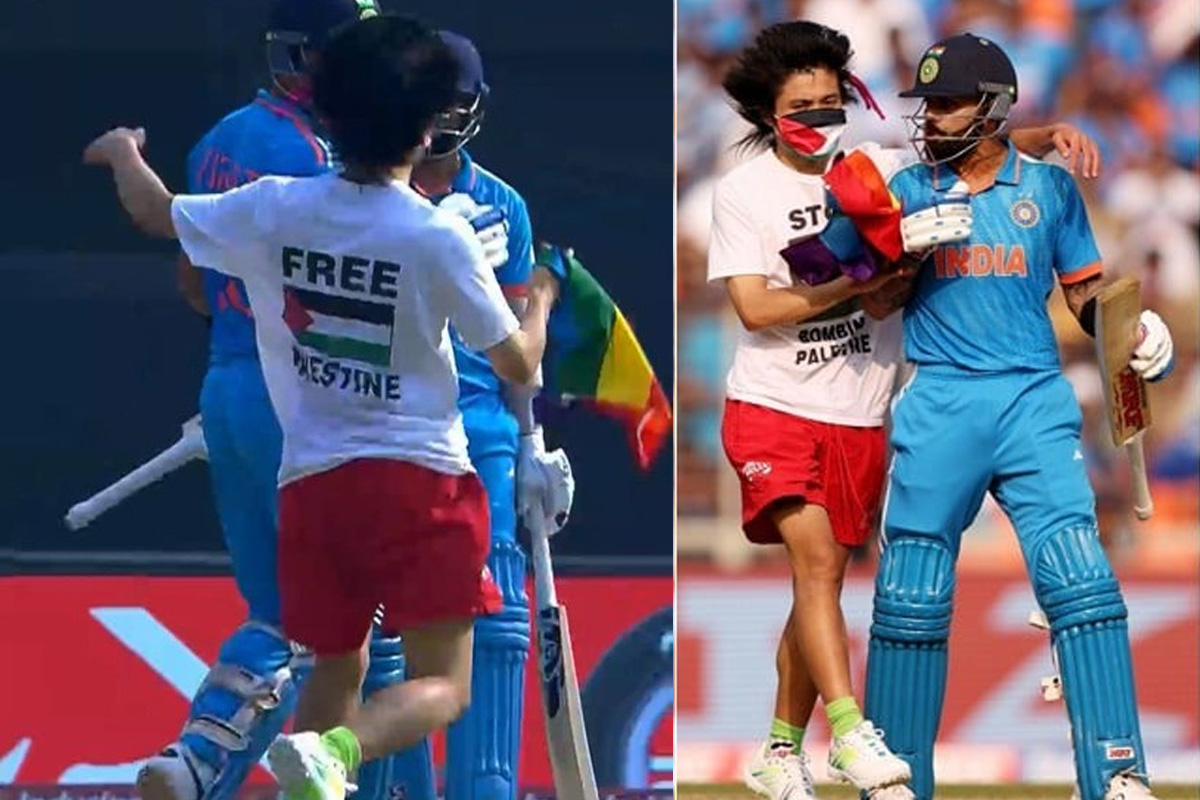احمد آباد کے نریندر مودی کرکٹ اسٹیڈیم میں کھیلے جارہے میچ کے 14ویں اوور میں فلسطین کے حامی نوجوان نے بھارتی بیٹر ویرات کوہلی کو لگے لگا لیا، جس کی تصویر سوشل میڈیا پر تیزی سے وائرل ہورہی ہے۔