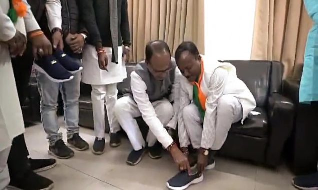 بی جے پی رہنما رام داس پوری نے سابق وزیر اعلی شیوراج سنگھ چوہان کی موجودگی میں جوتے پہنے۔