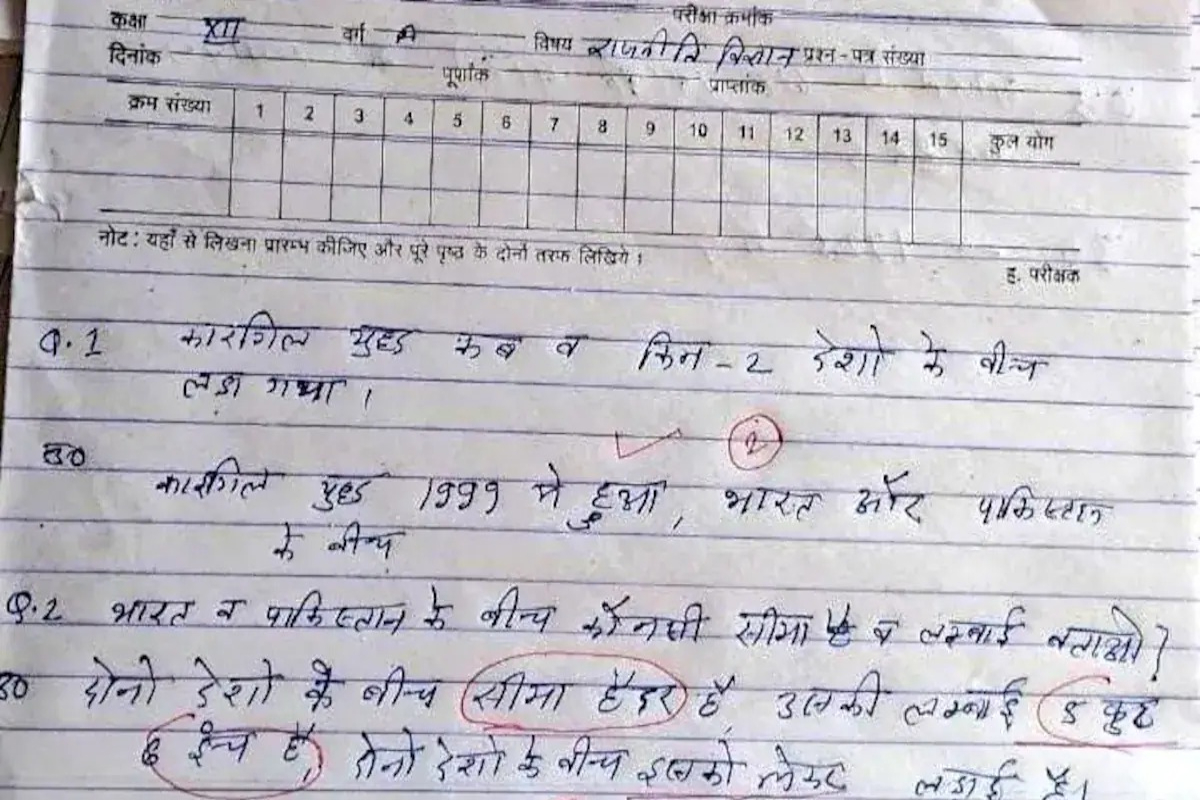طالبعلم نے جواب میں لکھا کہ ’پاکستان اور بھارت کے درمیان ‘سیما’ کا نام سیما حیدر ہے جس کی لمبائی 5 فٹ 6 انچ ہے اور دونوں ممالک کے بیچ اس کو لیکر لڑائی ہے۔