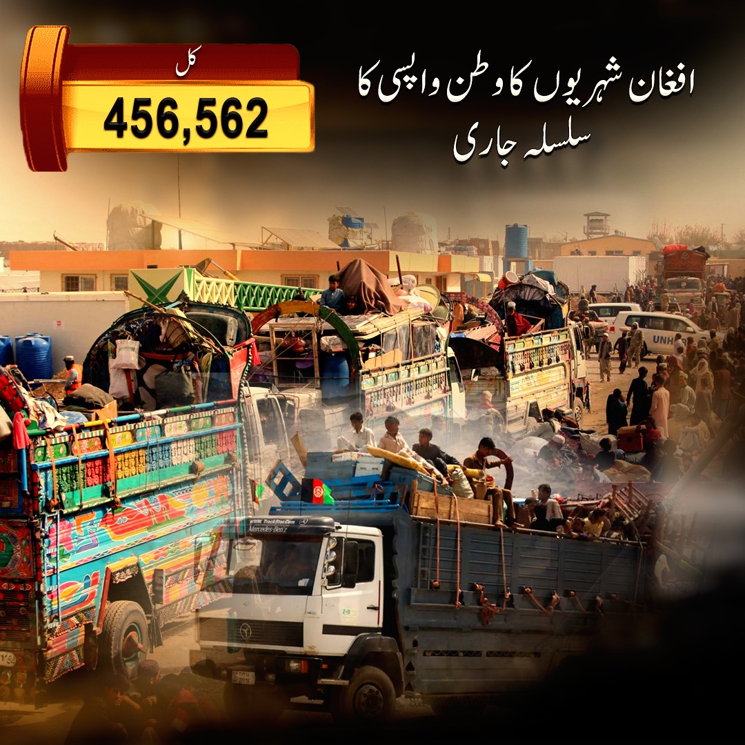 01 جنوری 2024 تک پاکستان چھوڑنے والے غیر قانونی افغان باشندوں کی کل تعداد 456,562 تک پہنچ چکی ہے اور واپسی کا یہ سلسلہ جاری اور ساری ہے۔