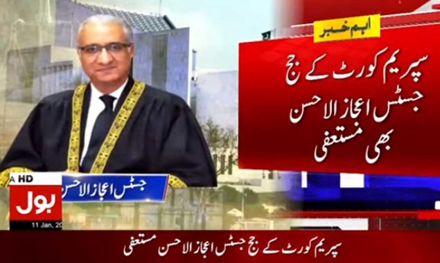 سپریم کورٹ کے جج جسٹس مظاہر نقوی کے بعد جسٹس اعجاز الحسن بھی مستعفیٰ ہوگئے ہیں اور انہوں نے اپنا استعفیٰ صدر مملکت ڈاکٹر عارف علوی کو بھجوادیا ہے۔