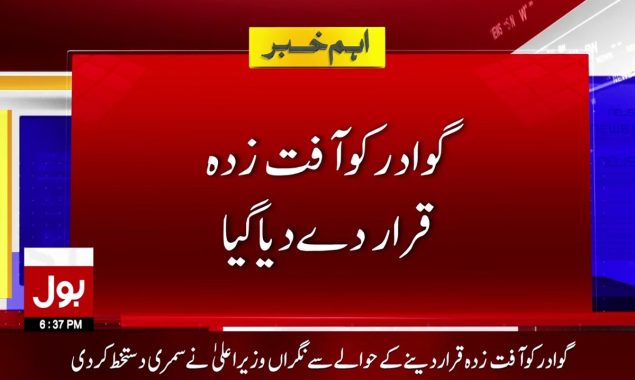 گوادر کو طوفانی بارشوں کے بعد تشویشناک صورتحال کے باعث آفت زدہ قرار دے دیا گیا۔