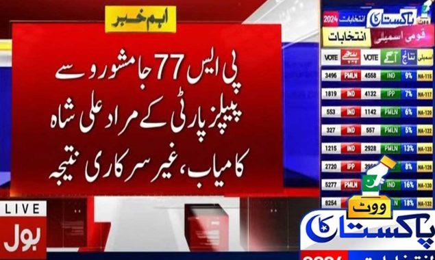 غیر سرکاری اور غیر حتمی نتائج کے مطابق پی ایس 77 جامشورو سے پاکستان پیپلزپارٹی کے مراد علی شاہ کامیاب قرار پائے ہیں۔ پی ایس 77 جامشورو 1کے تمام 169 پولنگ اسٹیشنز کے نتائج سامنے آگئے ہیں۔