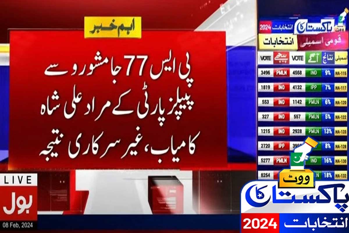 غیر سرکاری اور غیر حتمی نتائج کے مطابق پی ایس 77 جامشورو سے پاکستان پیپلزپارٹی کے مراد علی شاہ کامیاب قرار پائے ہیں۔ پی ایس 77 جامشورو 1کے تمام 169 پولنگ اسٹیشنز کے نتائج سامنے آگئے ہیں۔