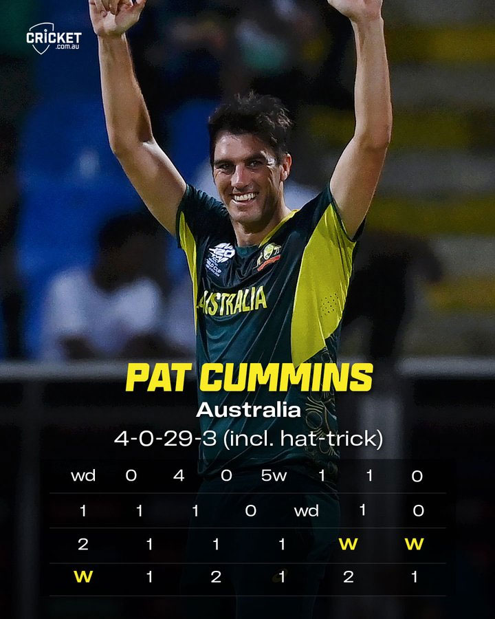 پیٹ کمنز ٹی ٹوئنٹی ورلڈ کپ  میں ہیٹ ٹرک کرنے والے مجموعی طور پر ساتویں اور بریٹ لی کے بعد دوسرے آسٹریلوی بولر بن گئے۔