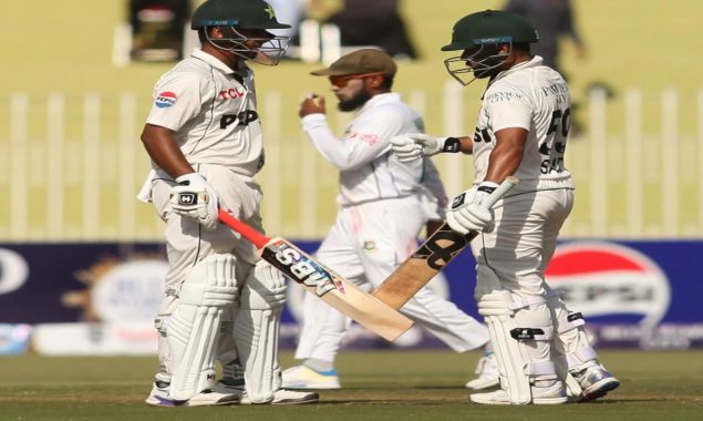پہلے دن کے اختتام پر سعود شکیل 57 رنز اور محمد رضوان 24 رنز کے ساتھ کریز پر موجود ہیں۔