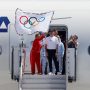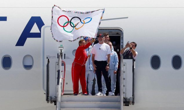 لاس اینجلس کی میئر کیرن باس اولمپک پرچم کے ہمراہ کھجور کے درختوں اور “ایل اے 2028” کے لوگو سے مزین ایک طیارے میں اتریں اور پانچ رنگوں والے بینر کو تھامے ٹارمک کو عبور کیا، جس میں متعدد امریکی ایتھلیٹس بھی شامل تھے۔