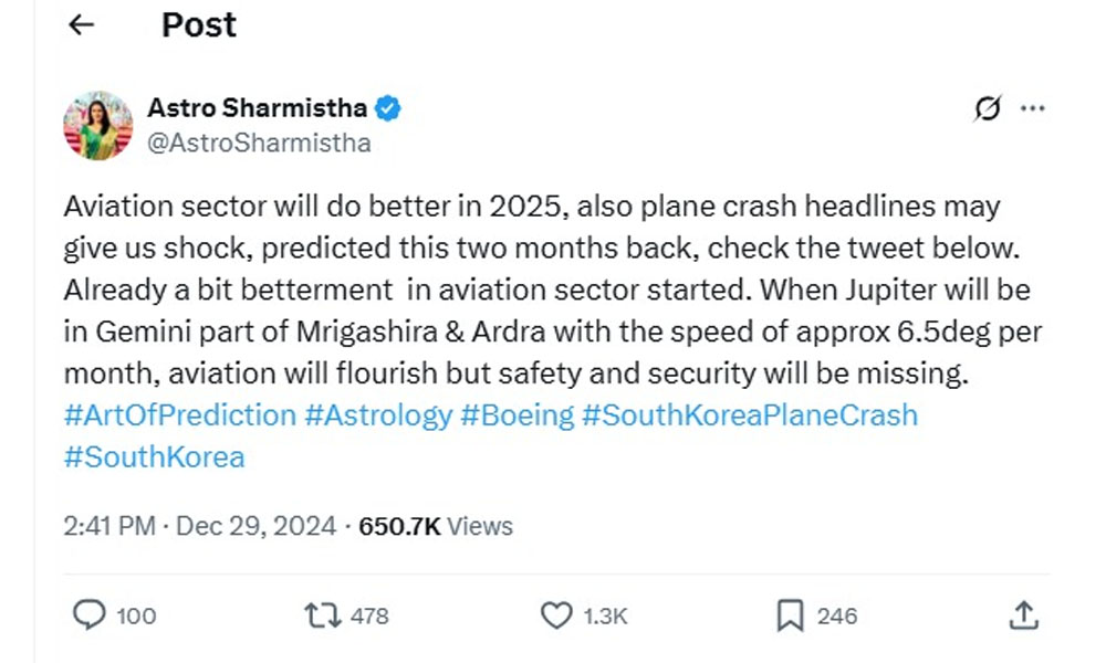 ماہرہ نجوم نے گزشتہ سال اپنے ایکس (سابقہ ٹویٹر) اکاؤنٹ پر ایک پوسٹ میں لکھا تھا کہ 2025 میں دنیا بھر میں ہوابازی کا شعبہ نمایاں ترقی کرے گا، لیکن اسی سال ایک بڑا ہوائی حادثہ خبروں کی زینت بنے گا۔