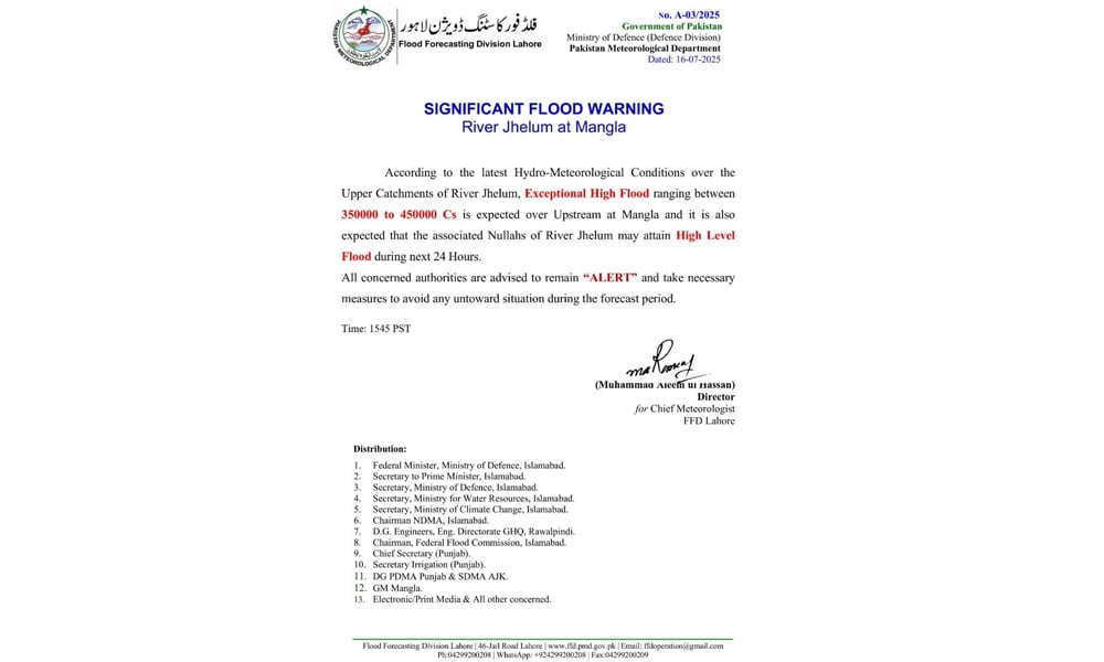 فلڈ فورکاسٹنگ ڈویژن کے مطابق منگلا کے مقام پر 4 سے 5 لاکھ کیوسک پانی کی آمد متوقع ہے، جو دریائے جہلم میں انتہائی شدید سیلاب کی صورت اختیار کر سکتا ہے۔ تمام متعلقہ اداروں کو فوری حفاظتی اقدامات کرنے کی ہدایت جاری کر دی گئی ہے۔
