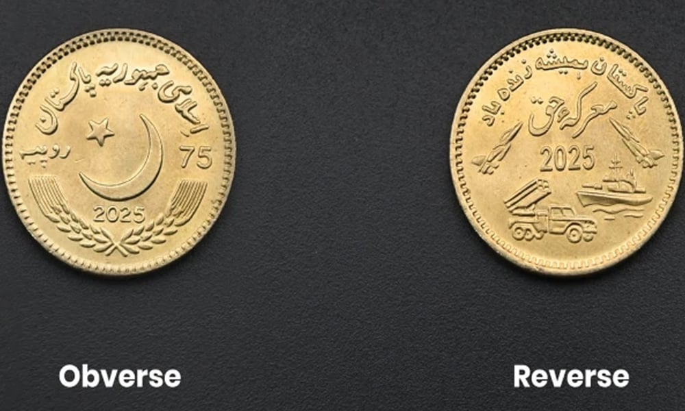 سکے کے پچھلے رخ پر اردو میں ’معرکۂ حق‘ اور ہندسوں میں 2025 درج ہے، جبکہ اس کے اطراف میں لڑاکا طیارے، بحری جہاز اور ملٹی پل راکٹ لانچر سسٹم ابھرے ہوئے دکھائی دیتے ہیں، جو ہمارے مسلح افواج کی طاقت و بہادری کا پیغام دیتے ہیں۔