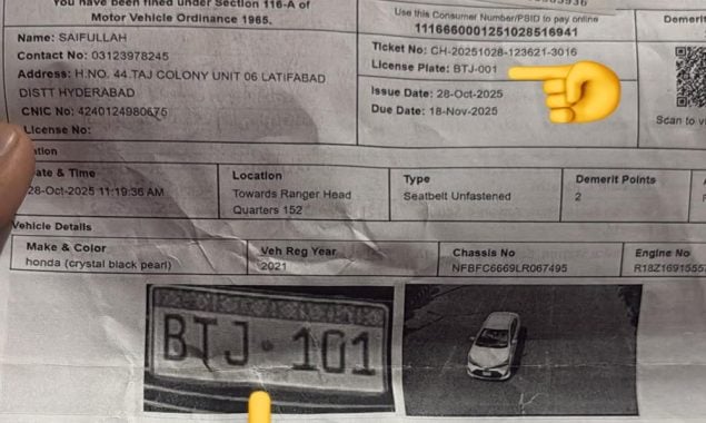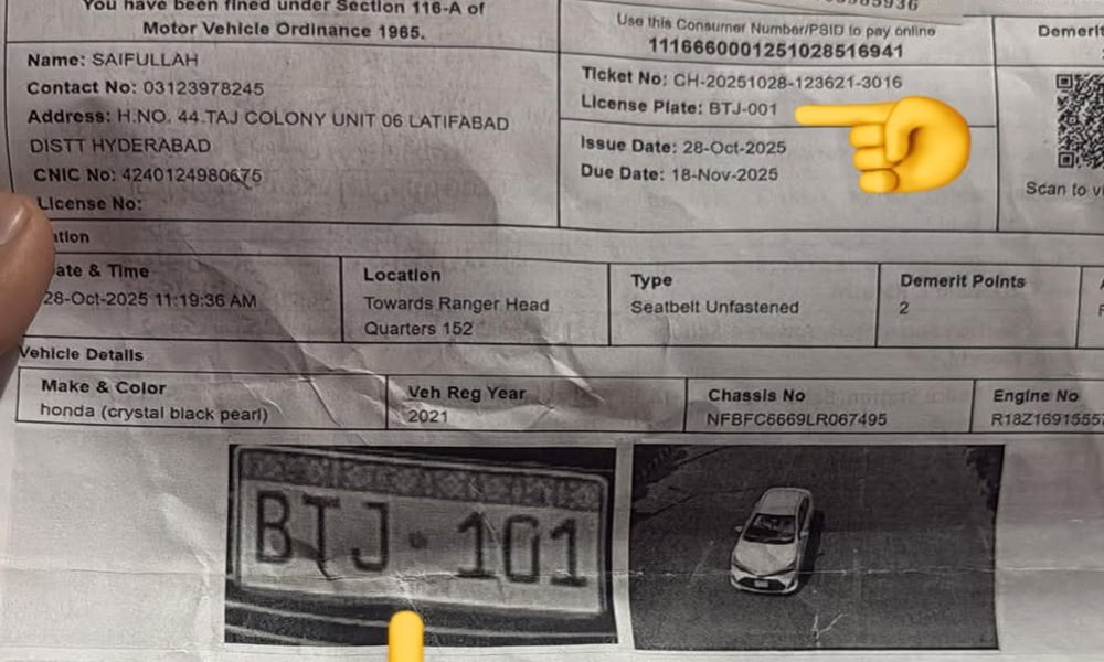 شہری نے مزید کہا کہ نہ صرف گاڑی کا ماڈل بلکہ نمبر پلیٹ بھی مختلف ہے، جس سے واضح ہوتا ہے کہ یہ چالان غلطی سے بھیجا گیا ہے۔