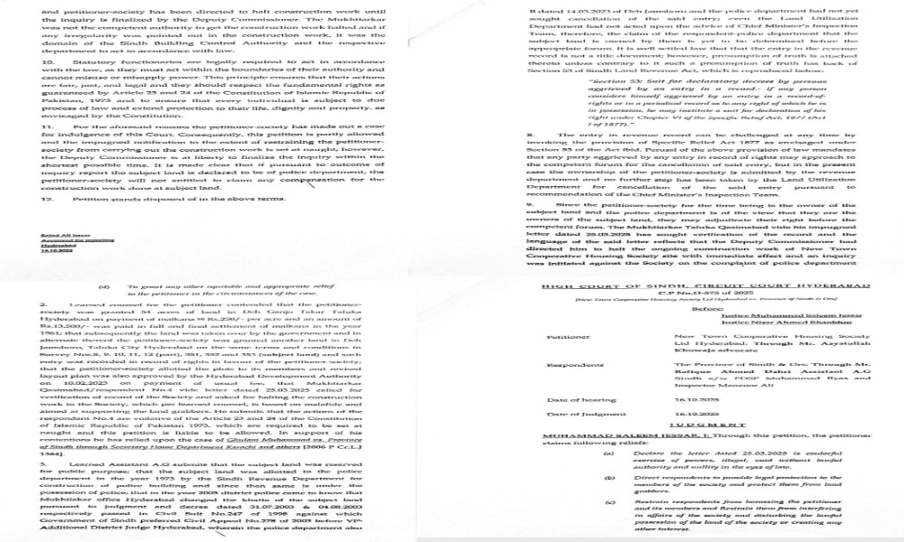 سندھ ہائیکورٹ نے نیو ٹاؤن کو آپریٹو ہاؤسنگ سوسائٹی لمیٹڈ اور سندھ پولیس کے درمیان 54 ایکڑ کی اربوں روپے مالیت کی زمین کے تنازع پر فیصلہ سنا دیا۔