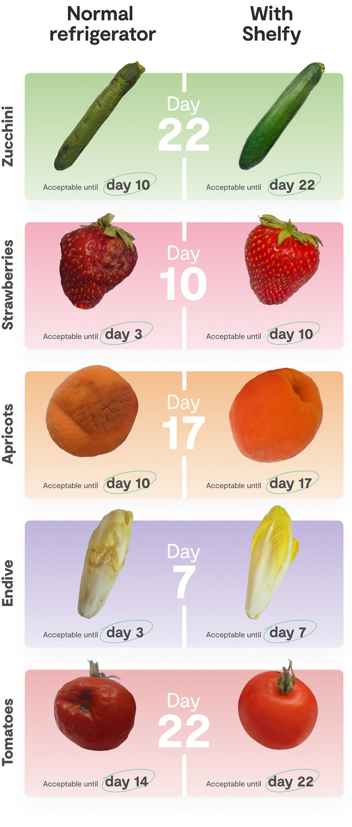 جب شیلفی کو فریج میں رکھا گیا تو اس نے مصنوعات کی شیلف لائف بڑھانے، مرجھانے، نرم ہونے، داغ اور سڑنے کی ظاہری شکل کو بہتر حالت میں رکھنے میں انتہائی مؤثر پایا گیا۔
