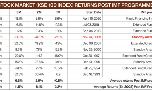 ایکویٹی مارکیٹ (کمپنیوں کے شیئرز اوراسٹاک کی تجارت کی جگہ) عام طور پر آئی ایم ایف کے پروگراموں کے ساتھ آنے والے بیرونی اشاریوں میں مالی نظم و ضبط اور استحکام کے لیے موافق جواب دیتی ہے۔ اوسطا پاکستان اسٹاک ایکسچینج (پی ایس ایکس) نے آئی ایم ایف پروگرام کے آغاز کے بعد مثبت منافع حاصل کیا ہے۔ تاہم، 2008ء میں عالمی کساد بازاری اس سے مستثنیٰ تھی۔
