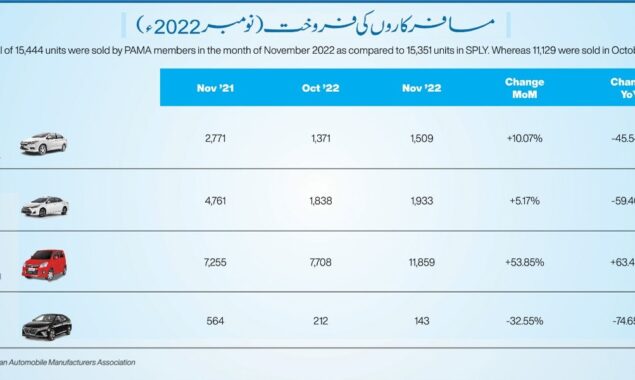 پاکستان آٹوموبائل مینوفیکچررز ایسوسی ایشن (پاما) کے جاری کردہ تازہ ترین اعداد و شمار کے مطابق، کاروں کی فروخت اکتوبر میں 11 ہزار 129 یونٹس کے مقابلے میں نومبر 2022ء میں 39 فیصد اضافے سے 15ہزار 444 یونٹس تک پہنچ گئی۔ سالانہ بنیادوں پر، کاروں کی فروخت کم رہی، جب کہ پچھلے سال کی اسی مدت کے دوران 15 ہزار 351 یونٹس فروخت ہوئے تھے۔