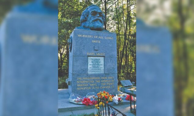 ہم ہائی گیٹ قبرستان (Highgate Cemetery) جانے کیلیے جب اُس سڑک پر پہنچے تو ہم پاگل خانے پہنچ گئے۔ برطانیہ میں بطور نظام جنم لینے والی سرمایہ داری نے یہاں بھی اُستادی سے کام لیا کہ اگر مارکس کی قبر، ہائی گیٹ قبرستان جا رہے ہو تو پہلے پاگل خانے سے گزر کر جاؤ۔ ہم نے پاگل خانے جانے والا راستہ چھوڑ کر مُتبادل راستہ اختیار کیا اور ایک اسکول اور بڑے پارک سے گزر کر ہائی گیٹ قبرستان کے دروازے تک جا پہنچے۔ میری معلومات کے مطابق یہ واحد قبرستان ہے جہاں داخلے کیلیے فیس مقرر ہے۔ گویا سرمائے کے خلاف لڑنے کے اُصول وضع کرنے والے کی قبر پر جانا ہو تو 6 پاؤنڈ سرمایہ دے کر جاؤ۔ جب ہم پہلے یہاں آئے تھے تو داخلے پر بائیں جانب کو استقبالیہ اور کچھ مارکسی کتابچوں کے علاوہ بعض دیگر اشیاء کا اسٹال ہوتا تھا۔ اب وہ اسٹال دائیں جانب کر دیا گیا ہے۔ گویا اب بائیں بازو کے اسٹال کو بند کر کے دائیں بازو پر اسٹال کھولا گیا ہے اور قبرستان میں کچھ مذہبی مُورتیوں اور دیگر علامات کی بہتات بھی کر دی گئی ہے۔ ہمارے دوسرے دورے کے بعد کچھ مارکس دشمن افراد نے اُس کی قبر پر حملہ کر کے اِس پر کندہ ایک قول کو مِٹانے کی کوشش کی تھی مگر حملہ آوروں کی یہ کوشش رائیگاں گئی کیونکہ ہم جب وہاں پہنچے تو وہ قول بھی اپنی جگہ پر بحال کیا جا چکا تھا جسے سُنہری الفاظ میں لکھا گیا تھا۔ یہاں بھی سرمایہ داری نے اُستادی کی، قبر پر درج الفاظ کا سُنہری رنگ سونے اور سرمائے کی اہمیت کو اُجاگر کر رہا ہے۔ ویسے آپ وہ قول بھی پڑھ لیں جسے مِٹانا ضروری سمجھا گیا تھا۔