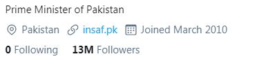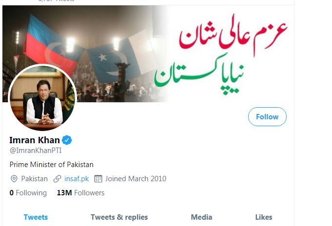وزیراعظم پاکستان عمران خان سوشل میڈیا پلیٹ فارم ٹوئٹر پر بھی چھا گئے ہیں اور اب ان کے 13 ملین فالوورز ہوگئے ہیں۔