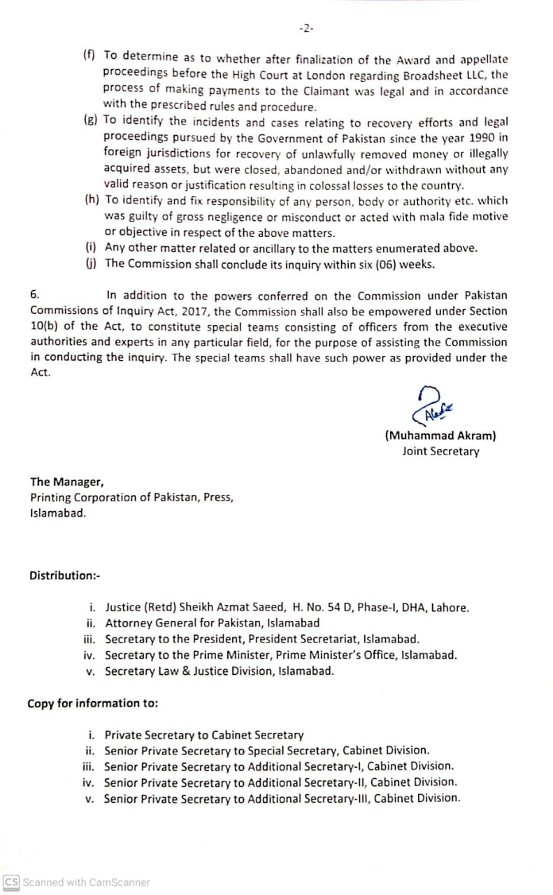 حکومت کی جانب سے نوٹیفکیشن کے مطابق کمیشن انکوائری ایکٹ دوہزارسترہ کے تحت تشکیل دیاگیا ہے جو کہ براڈشیٹ معاملے کی تحقیقات چھ ہفتے میں مکمل کی جائے گی۔
