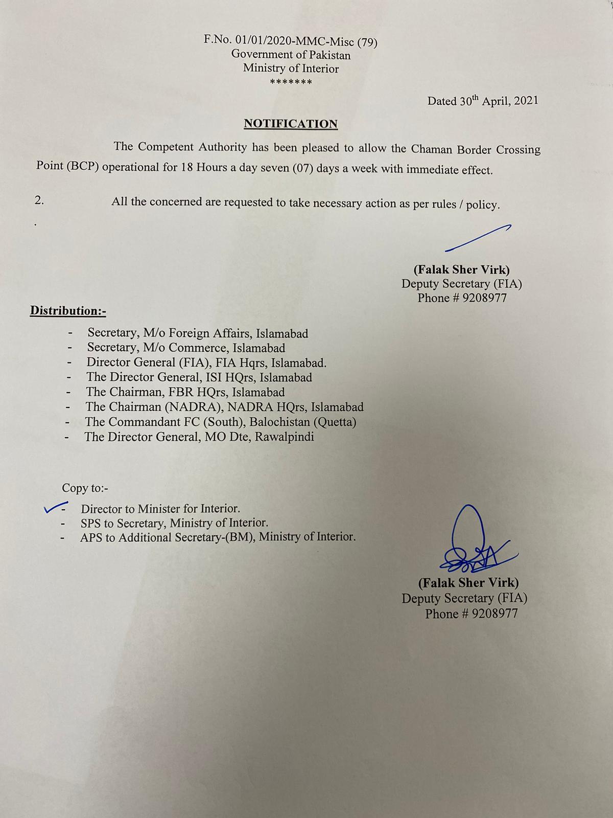 وزارت داخلہ کے فیصلے کے مطابق چمن بارڈر پر کراسنگ پوائنٹ ہفتے کے سات دن کھلا رہے گا اور دن میں اٹھارہ گھنٹے آپریشنل رہے گا۔