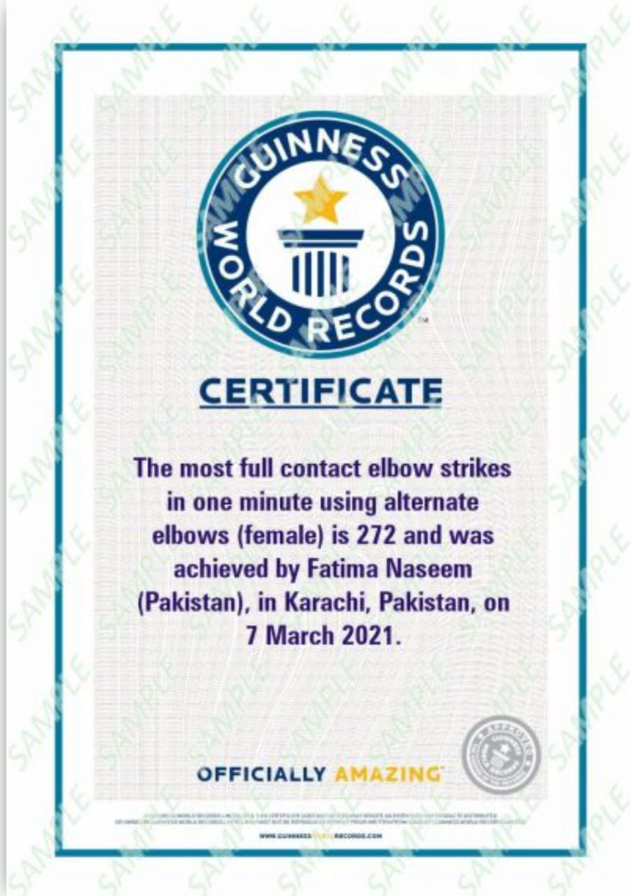 فاطمہ نسیم نے ایک منٹ میں 258 مرتبہ کہنی مارنے کے مقابلے میں 272 مرتبہ دونوں ہاتھوں سے کہنی کو ٹارگٹ پر ہٹ کیا اور واضح برتری کے ساتھ ریکارڈ کو پاکستان کے نام کیا۔
