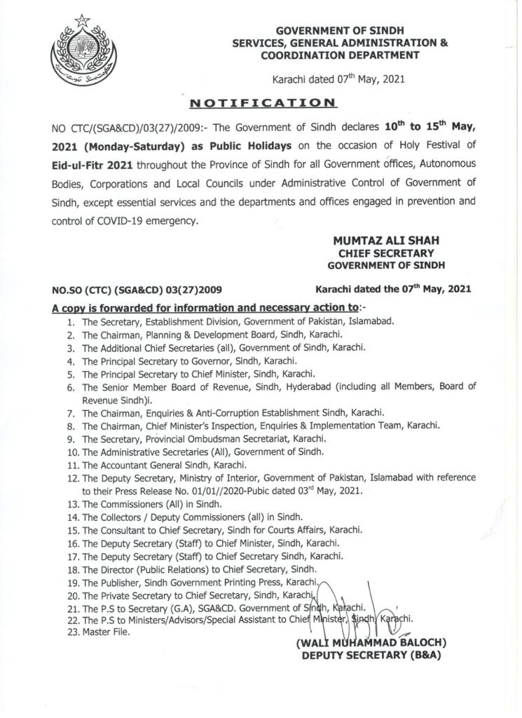 جاری نوٹیفکیشن کے مطابق 10 مئی تا 15 مئی تک سندھ حکومت کے تمام محکموں میں عید الفطر کی تعطیلات ہونگی تاہم لازمی سروس والے محکموں کے دفاتر کھلے رہینگے۔