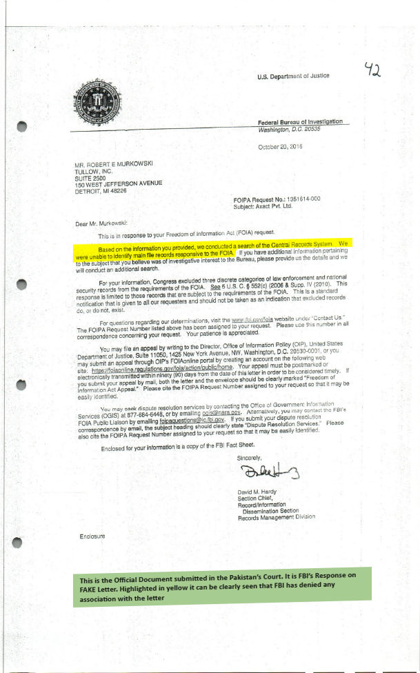 ایف بی آئی نے جن جعلی کاغذات کو مسترد کیا ہے اس کی کاپی بول نیوز مینجمنٹ کے پاس موجود ہے۔