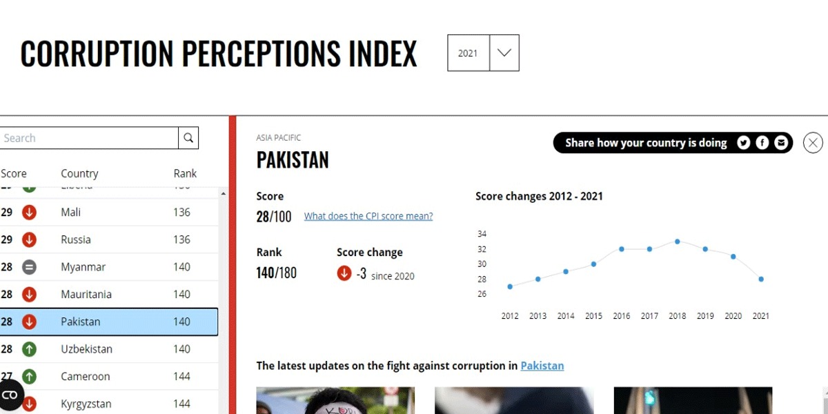 2021 کے کرپشن پرسیپشن انڈیکس پاکستان کی 16 درجے تنزلی ہوئی ہے اور اب ہمارا ملک 140 ویں نمبر پر آگیا ہے ، اس کے علاوہ اس کے پوائنٹس بھی 31 سے گھٹ کر 28 ہوگئے ہیں۔
