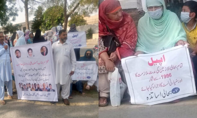 مظاہرین کا کہنا ہے کہ تمام بحالی ملازمین کی سنیارٹی لسٹ کا اجراء کیا جائے، بچوں کا مستقبل محفوظ کریں اور بڑھاپے میں ذلت سے بچائیں۔