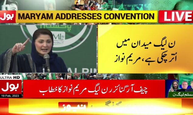 تفصیلات کے مطابق ن لیگ کی سینئر نائب صدر اور چیف آرگنائزر مریم نواز نے مسلم لیگ ن کے تنظیمی ورکرز کنوینشن سے خطاب کرتے ہوئے کہا کہ نواز شریف چاہے لندن میں ہو یا لاہور میں عوام انہی سے محبت کرتے ہیں۔