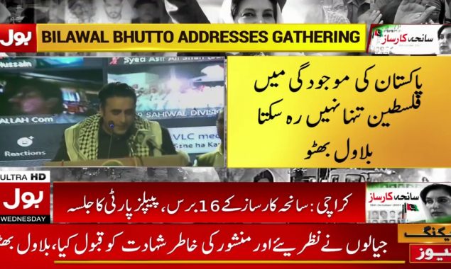ان کا کہنا تھا کہ محترمہ شہید بینظیر بھٹو پہلی وزیراعظم تھیں جنہوں نے فلسطین اور غزہ کا دورہ کیا، بی بی نے دنیا کو دکھایا کہ پاکستان کی پہلی خاتون وزیر اعظم فلسطین کے ساتھ کھڑی ہے، یاسر عرفات محترمہ کی دعوت پر گڑھی خدا بخش بھٹو بھی آیا تھا، ہم مطالبہ کرتے ہیں کہ حکومت صرف ہماری نہیں بلکہ فلسطین کی بھی ہے، آپ صرف ہمارے وزیر اعظم اور وزیرخارجہ نہیں ہیں، آپ کو فلسطین کے لیے کچھ نہ کچھ کرنا پڑے گا، فلسطین کے شہداء کے اشو پر پورا پاکستان ایک ہے، نہ میرا نہ تیرا ہم سب کا پاکستان کے نعرے کے تحت ملک چلانا پڑے گا۔