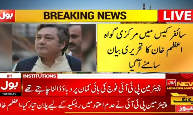 اعظم خان نے تحریری بیان میں بتایا کہ چیئرمین پی ٹی آئی اداروں پر تحریک عدم اعتماد میں مدد کے لیئے ڈباؤ ڈالنا چاہتے تھے، سائفر کے حوالے سے اسپیکر کے غیر قانونی رولنگ چیئرمین پی ٹی آئی کی بطور وزیر اعظم ہدایات پر دی گئی، چیئرمین پی ٹی آئی نے سائفر کی کاپی حاصل کی اور بعد میں کہا کہ کاپی گم ہو گئی ہے، عمومی طور پر سائفر جس چینل سے آتا ہے اسی چینل سے واپس بھیجا جاتا ہے۔