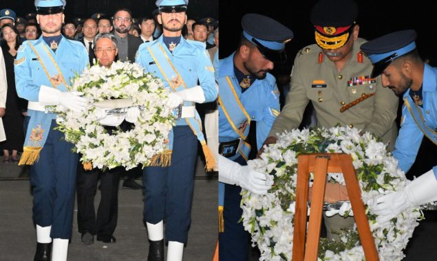 تفصیلات کے مطابق صدرِ پاکستان آصف علی زرداری، وزیرِ اعظم شہباز شریف ،چیئرمین جوائنٹ چیفس آف اسٹاف کمیٹی جنرل ساحر شمشاد کی جانب سے پھول رکھے گئے۔