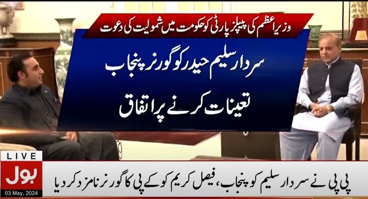 ذرائع کا کہنا ہے وزیراعظم شہبازشریف نے بلاول بھٹوسے ملاقات میں فیصلےسےآگاہ کیا، ملاقات میں گورنرپنجاب کے لیے سردارسلیم حیدرخان کےنام پراتفاق کیا گیا۔