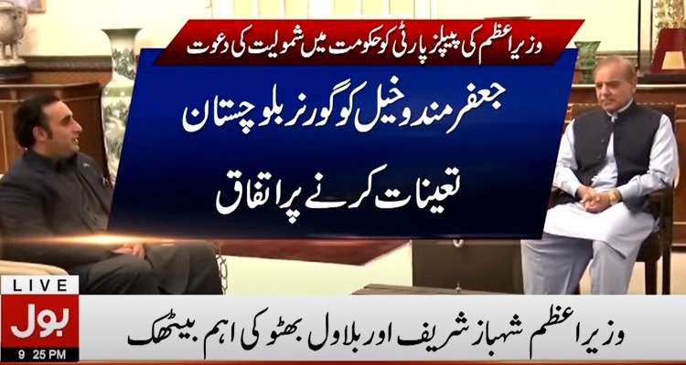 چیئرمین پیپلزپارٹی بلاول بھٹو اور وزیراعظم کے درمیان ہونے والی ملاقات میں مسلم لیگ ن کے صوبائی صدرجعفرمندوخیل کو گورنربلوچستان مقررکرنے پراتفاق کیا گیا۔