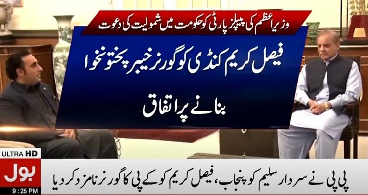 ذرائع کا یہ بھی کہنا تھا کہ پیپلزپارٹی گورنرکے پی کے لیے مزیدمشاورت کےبعد نام سےآگاہ کرےگی۔ تاہم پیپلز پارٹی کے رہنما فیصل کریم کنڈی کو گورنرخیبرپختونخوا بنانے جانے کا امکان ہے۔