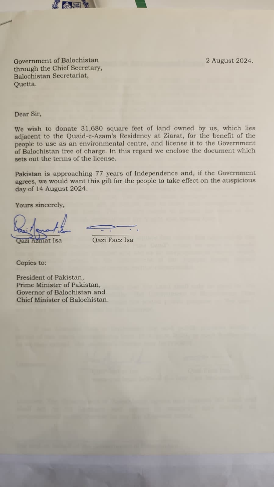 قاضی فیملی نے 77 ویں جشن آزادی کے موقع پر اپنی زمین قوم کے لیے دے دی، تاہم زیارت کوئٹہ میں قائداعظم ریزیڈنسی سے منسلک آراضی انورمنٹل سنٹر کودے دی گئی۔