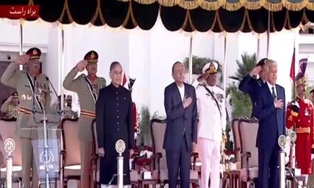تقریب کے دوران آرمی، نیوی اور فضائیہ کے دستوں نے مارچ پاسٹ کیا اور قومی پرچم کو سلامی دی۔