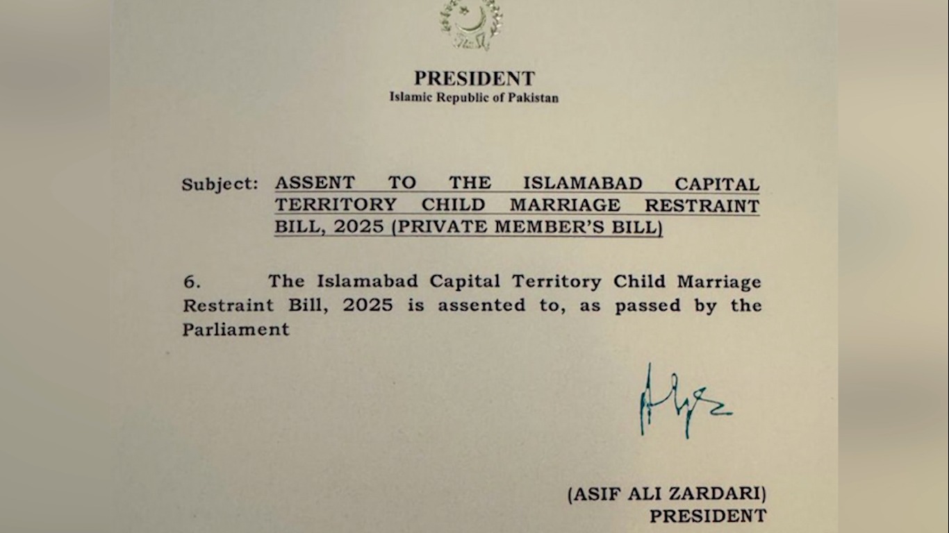 صدر مملکت آصف علی زرداری نے اٹھارہ سال سے کم عمری کی شادی پر پابندی کے بل 2025 پر دستخط کردیے ہیں، جس کے بعد اٹھارہ سال سے کم عمری کی شادی پر بننے والے قانون پر عملدرآمد کا آغازہوگیا ہے۔