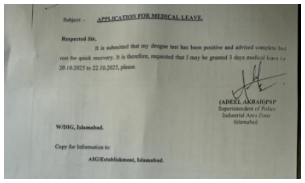 دستاویزات کے مطابق عدیل اکبر نے بیماری کے باعث اپنی رخصت کی درخواست ڈی آئی جی اسلام آباد کو ارسال کی تھی۔