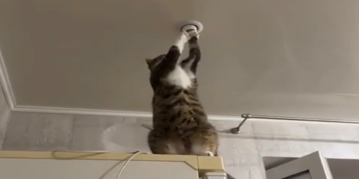ویڈیو میں دیکھا جاسکتا ہے کہ بلی بلب کو ٹھیک کرنے کی کوشش کررہی ہے۔