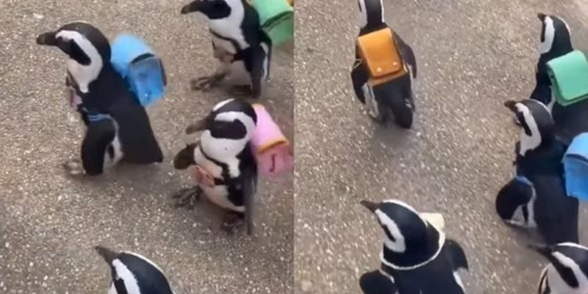 ٹویٹر پر ایک ویڈیو شیئر کی گئی جس میں پینگوئنز رنگ برنگے بیگ اٹھائے ہوئے نظر آ رہے ہیں کہ جیسے سب مل کر اسکو ل یا ٹرپ پر جا رہے ہوں۔