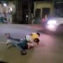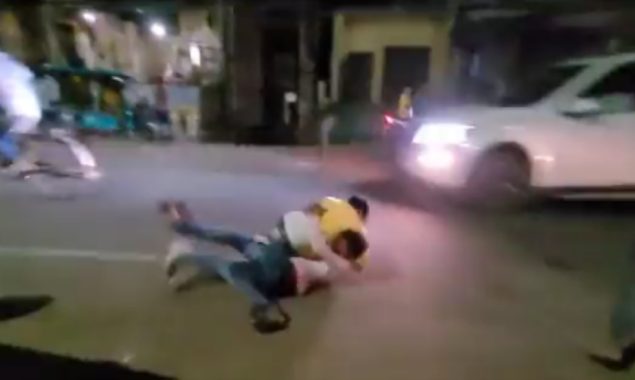 ویڈیو میں دیکھا جاسکتا ہے کہ سڑک پر ٹریفک رواں دواں ہے اور دونوں لڑنے میں مصروف ہیں۔